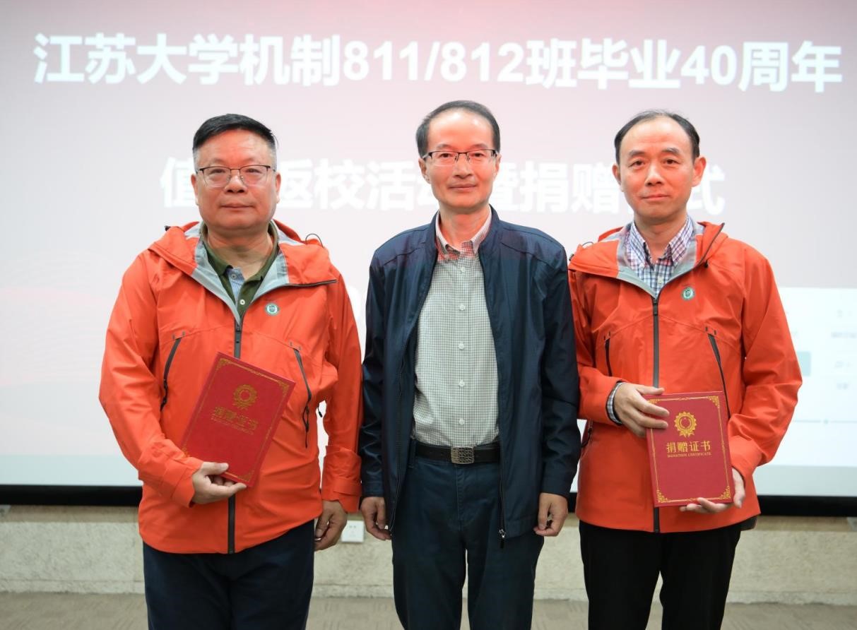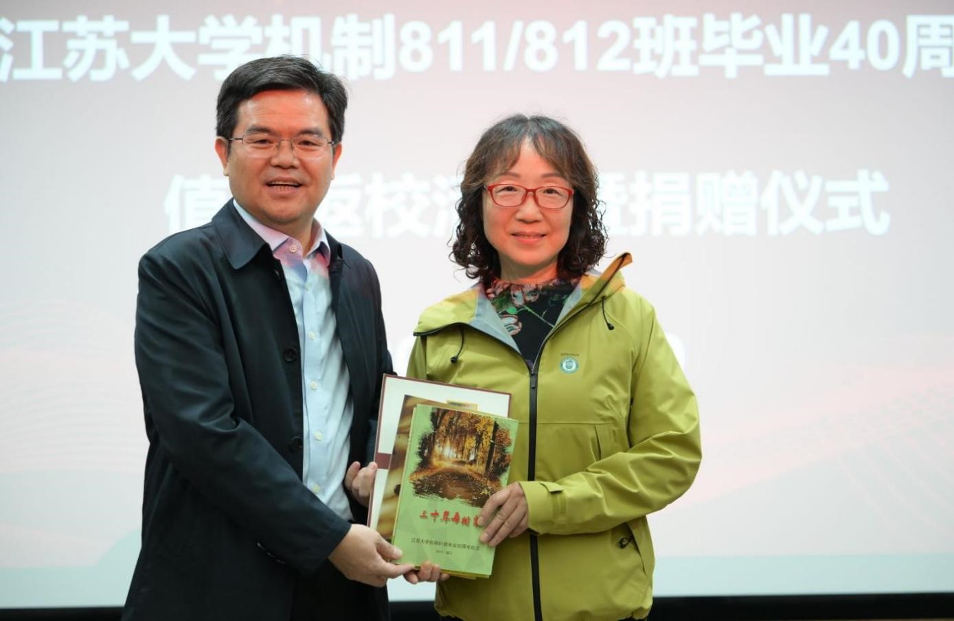 本次40周年校友返校筹备会秘书长姜荣萍教授向母校捐赠了几本校友返校活动纪念册。这些校友返校团聚纪念册承载了广大校友对母校的思念之情。江苏大学李洪波书记向姜荣萍教授颁发了《捐赠证书》。