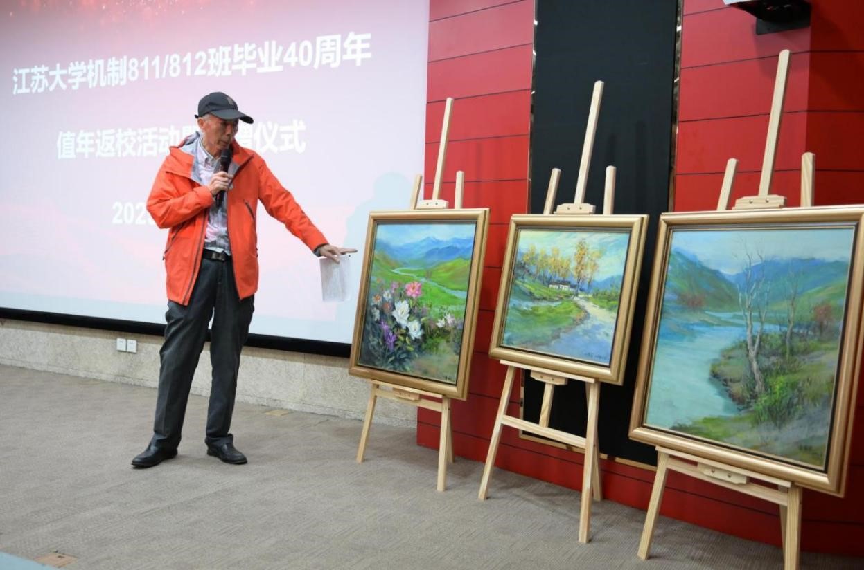 江苏大学校友著名油画家冯振华向母校江苏大学捐赠了精心创作的三幅油画艺术品,包括《草原心愿》、《深秋依旧》和《春江水暖》。著名油画家冯振华现场讲解了三幅油画作品创作的心路历程,还介绍了油画作品的风格特点和作品内涵。