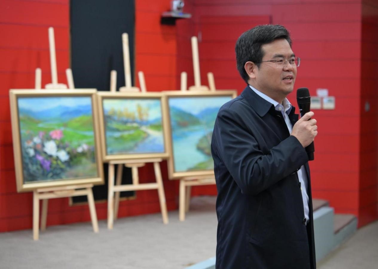 上图为:著名油画家冯振华现场讲解捐赠的三幅油画作品。