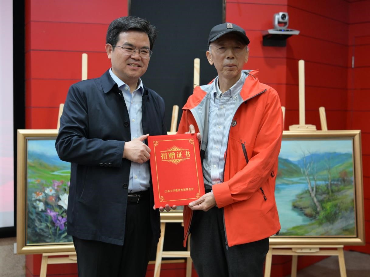 上图为:江苏大学领导李洪波书记与著名油画家冯振华颁发油画艺术品捐赠收藏证书。