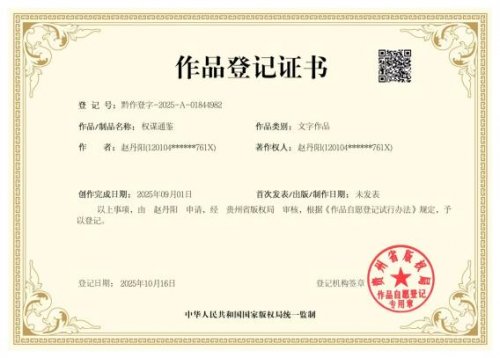 《权谋通鉴》是赵丹阳创作的文学作品,该作品于2025年9月1日完成创作,于2025年10月16日在贵州省版权局登记,登记号:黔作登字-2025-A-01844982。